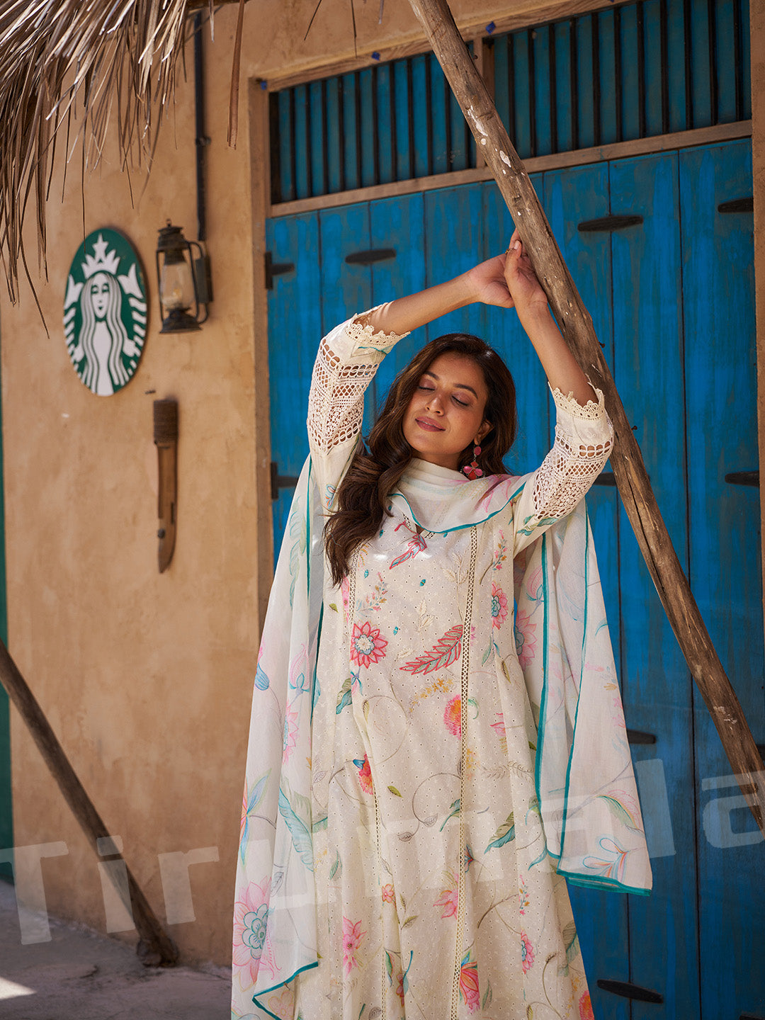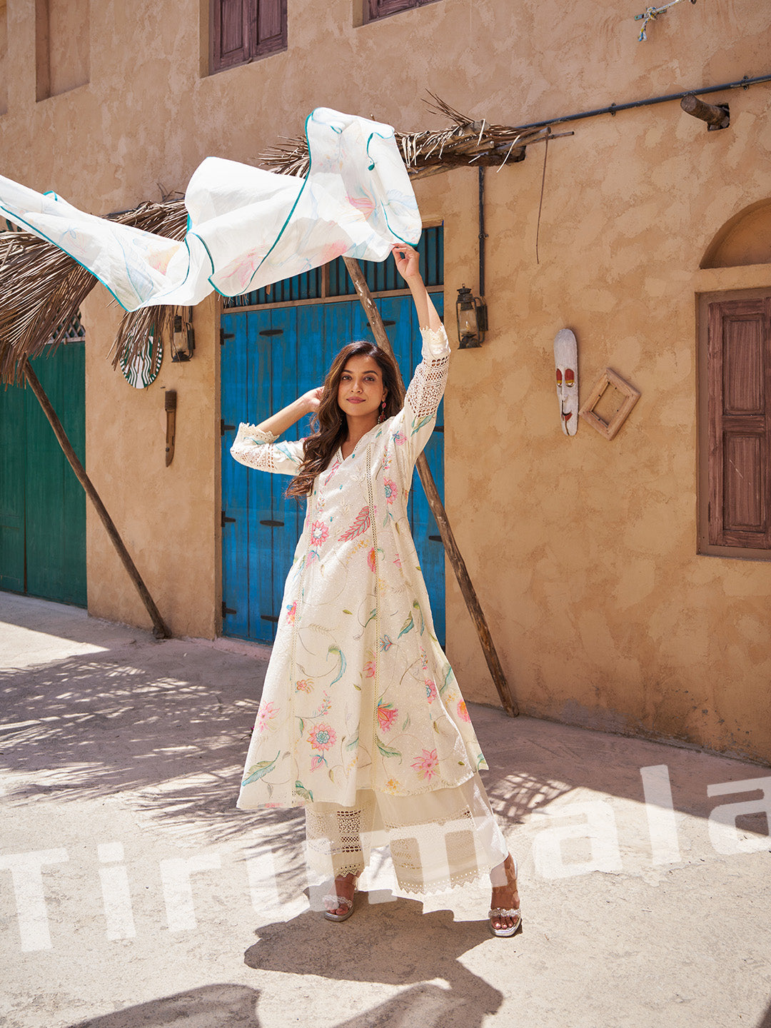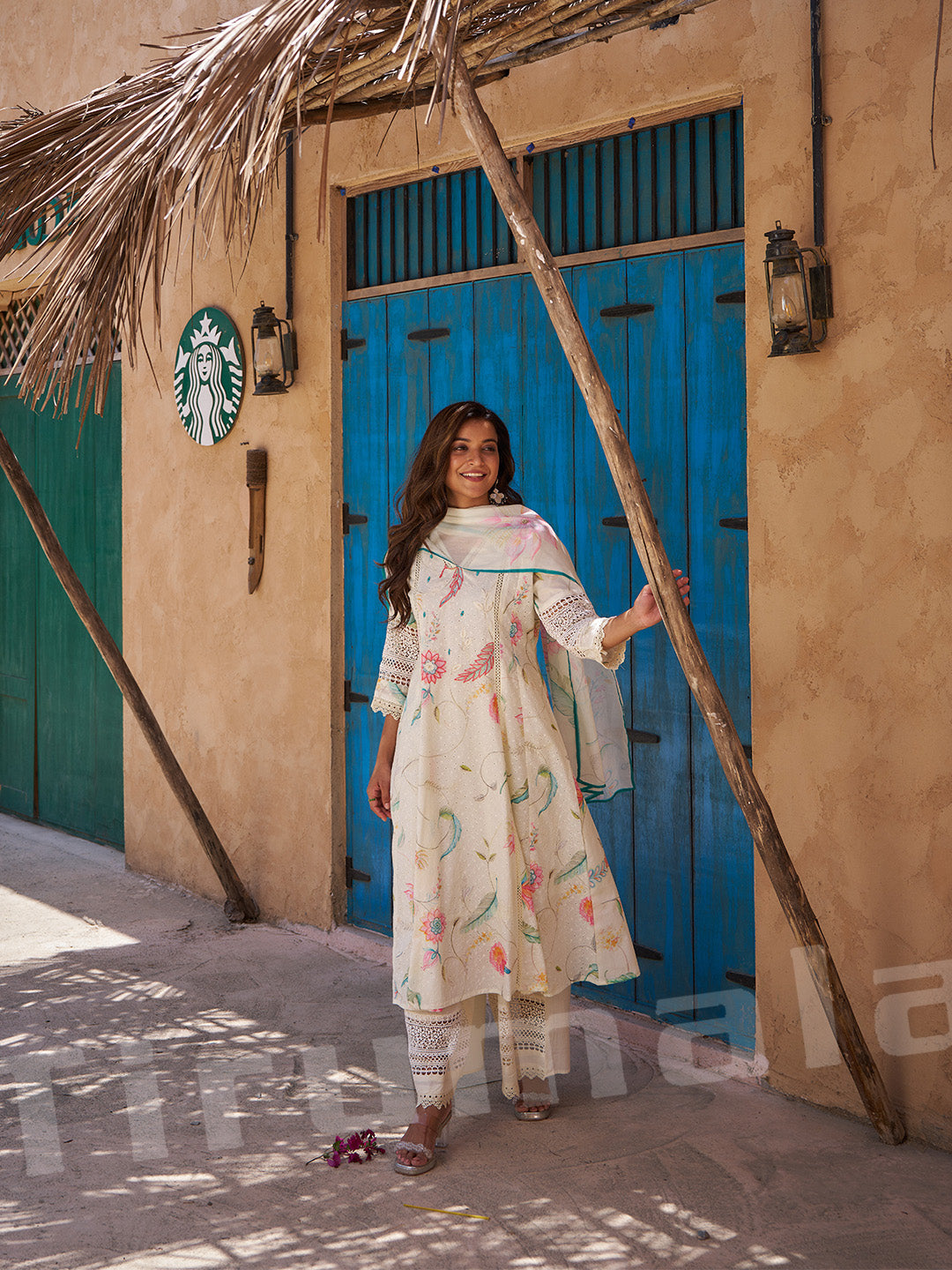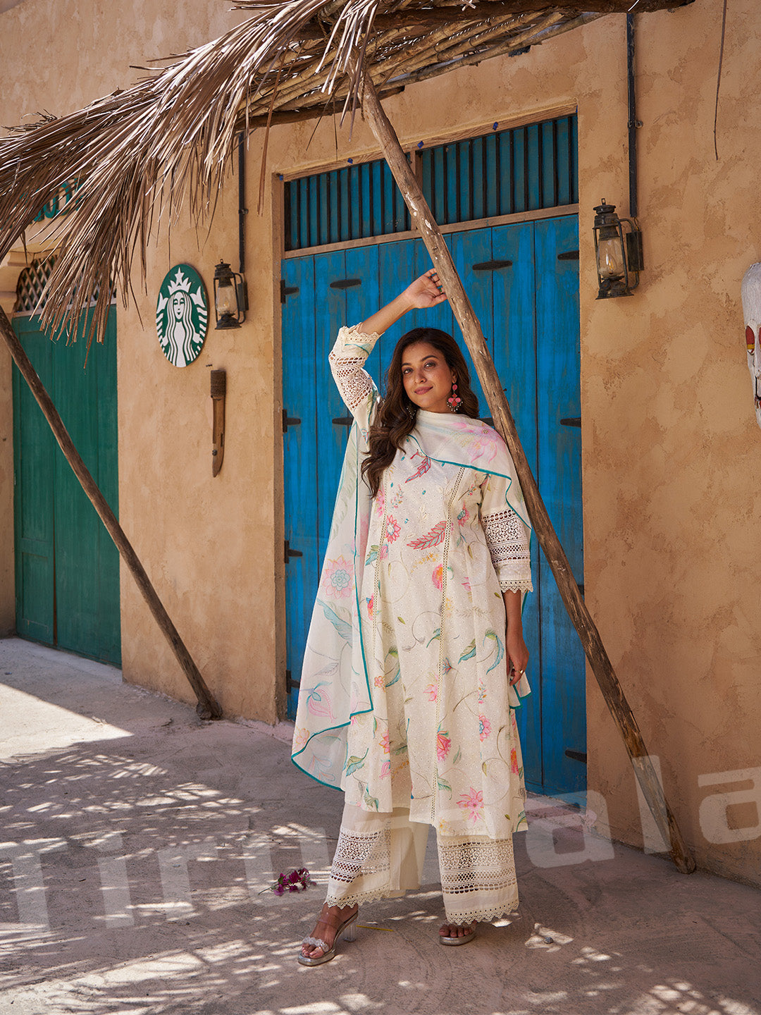 - This beige three-piece outfit blends tradition with elegance, featuring a soft floral print enhanced by shimmering zari and thread embroidery. The kurta, bottom, and dupatta come together for a sophisticated, coordinated look—perfect for festive functions, family gatherings, or understated celebration wear.