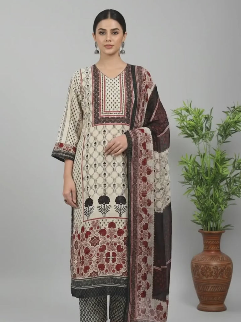 This refined 3-piece kurti set in crepe silk showcases an elegant off-white base adorned with intricate ethnic prints in rich maroon and black tones.