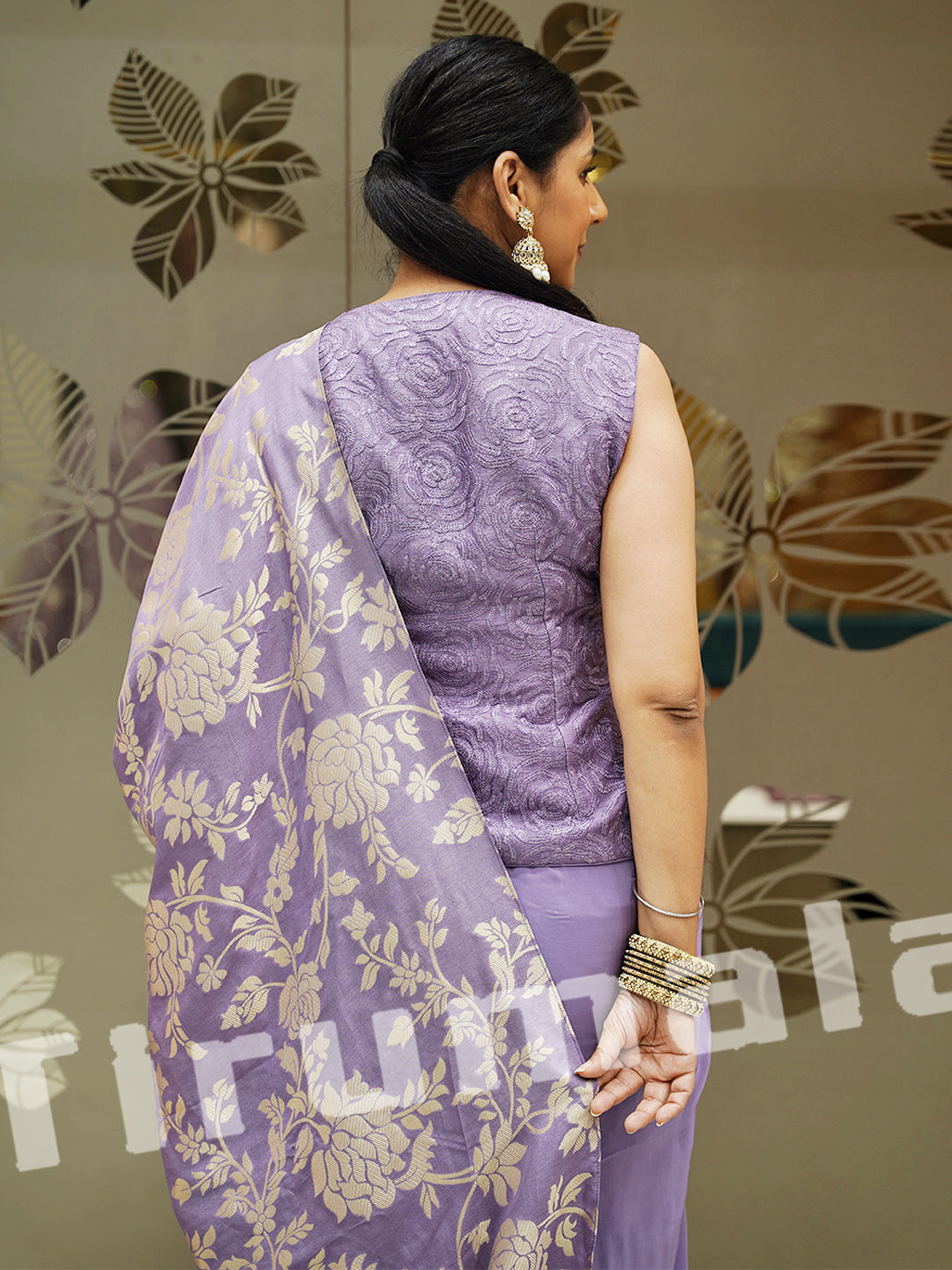 - An exquisite lavender Indo-western outfit that features a silk thread-work top styled with a unique skirt-dhoti bottom made from soft crepe. This fusion silhouette merges traditional embroidery with modern draping, making it a perfect choice for cocktail parties or mehendi functions.