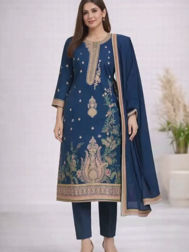 This sophisticated navy blue 3-piece kurti set is crafted in luxurious dola silk, offering a smooth texture and graceful fall.