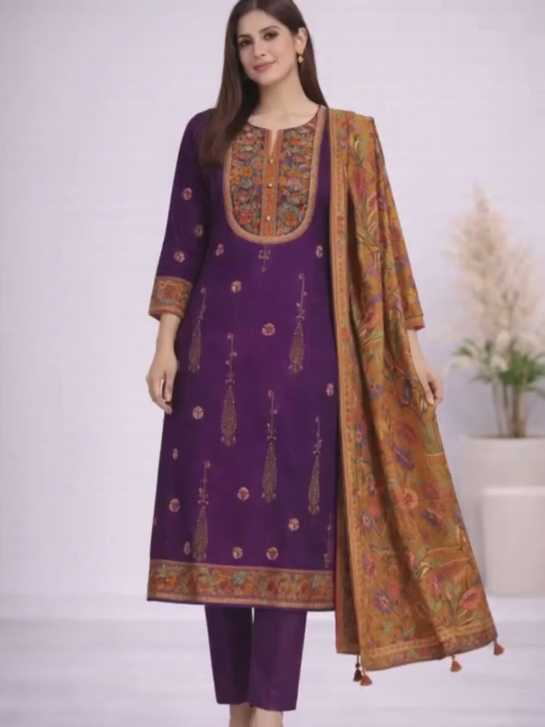 This elegant 3-piece kurti set in luxurious tussar silk features a rich royal purple base enhanced with intricate handwork detailing.