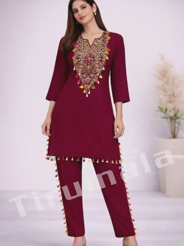 The straight-fit silhouette with tassel detailing along the edges creates a playful yet elegant look. Ideal for festive gatherings, celebrations, or standout daywear.
