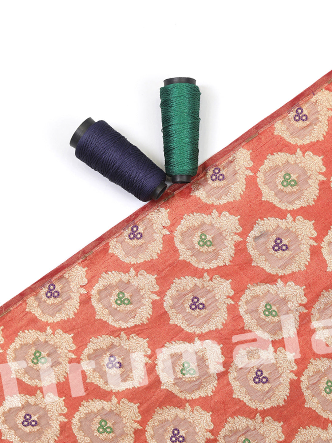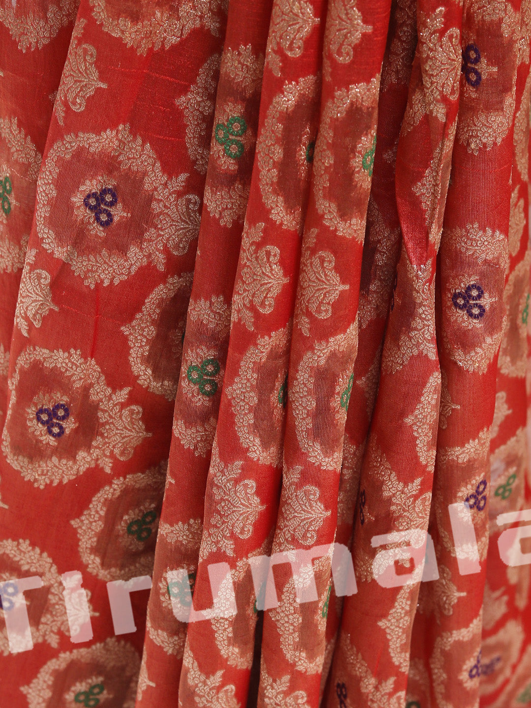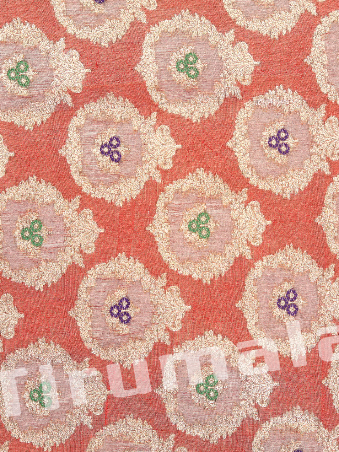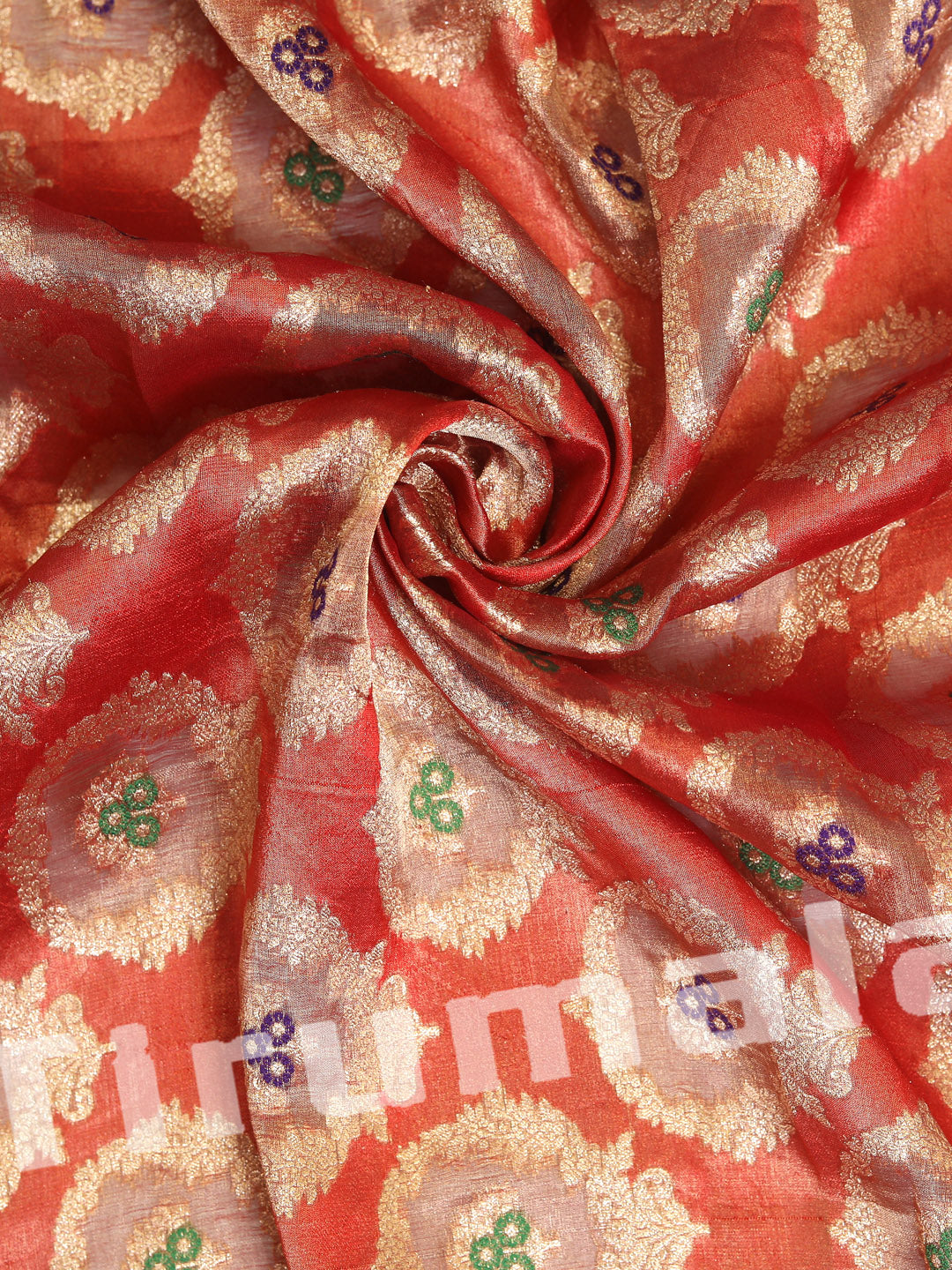 This classic red tissue silk fabric features gold butti work, creating a festive and luxurious vibe. It's ideal for creating traditional silhouettes like lehengas or festive kurtas.