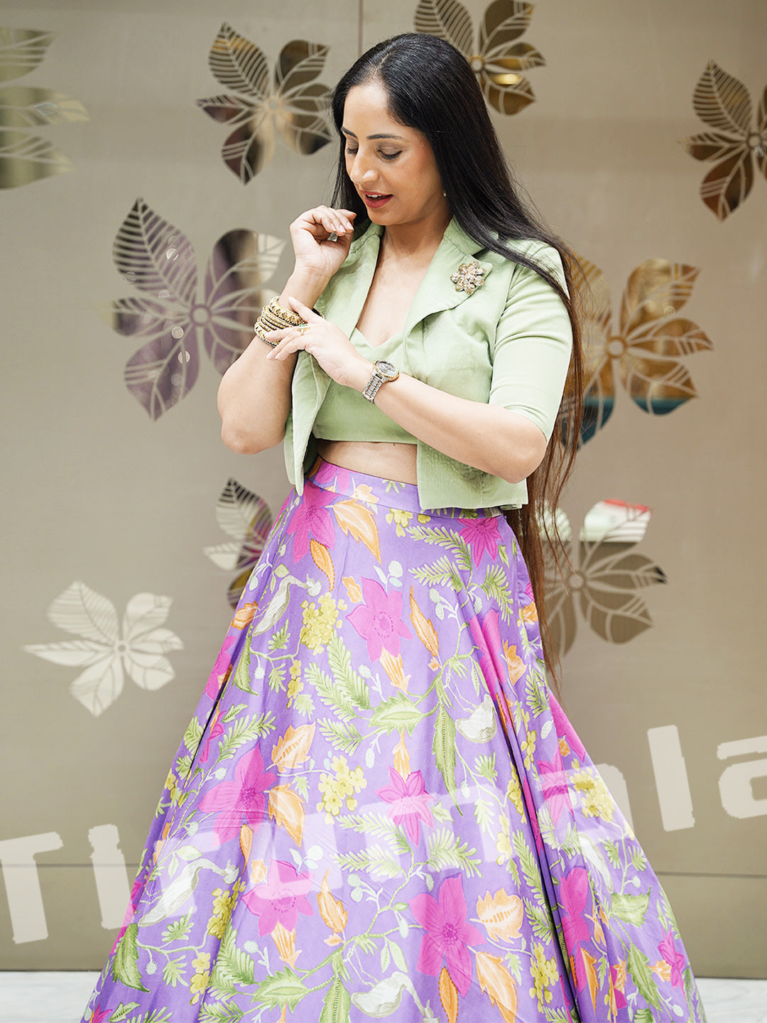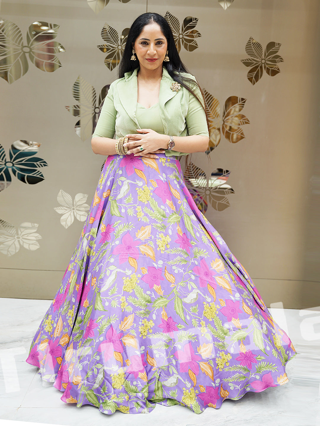 - A stunning fusion outfit featuring a richly textured velvet jacket paired with a flowy printed lehenga. The luxurious velvet adds depth and warmth, while the printed lehenga brings a playful contrast. This combination is ideal for winter weddings, receptions, or festive celebrations that demand elegance with a twist.